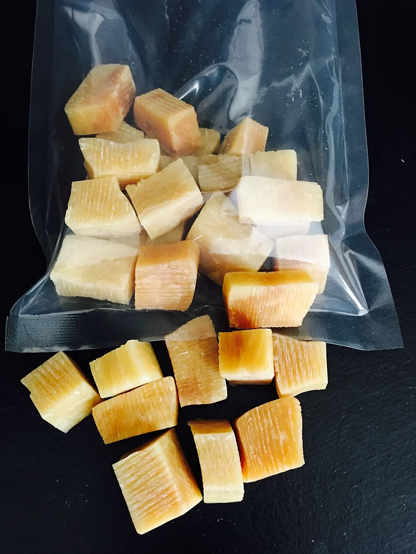 Chew nuggets are approximately 1-2 cm dice each side. Not to treat your dog as is. Instead, microwave for approximately 1 minute (microwave time varies) to make a crunchy puff. Let a puff cool down to room temperature and treat your dogs with a crunchy puff! your dogs love it.